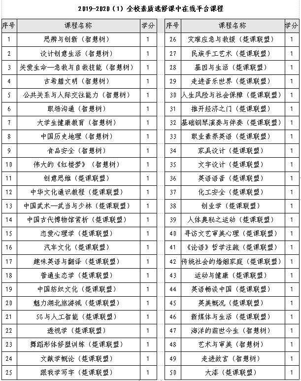 3、本学期共开设50门在线平台素质选修课,每名学生限选一门课程。