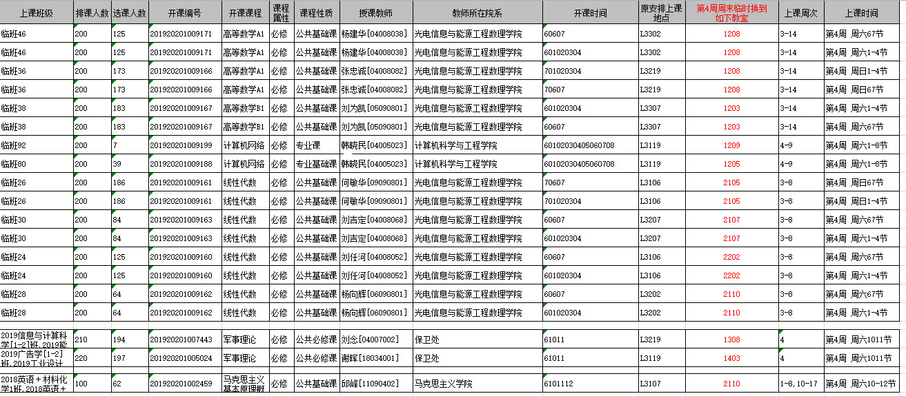 由于第4周周末第3教学楼有一级建造师考试,安排在3教周六、日的重修课程临时换到1教、2教学楼的教室(仅第4周周六、日需要临时更换教室,其它周次的重修课上课教室不变),具体课程的临时上课教室见下表。请需要重修的同学第4周周六、日到调整后的教室上课,并请相互转告。谢谢。